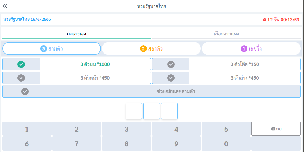 เลือกเลขที่ต้องการได้เลย 3 ตัว 2 ตัว วิ่งบน วิ่งล่าง เลือกเสร็จใส่ราคาลงไปและยืนยันโพย